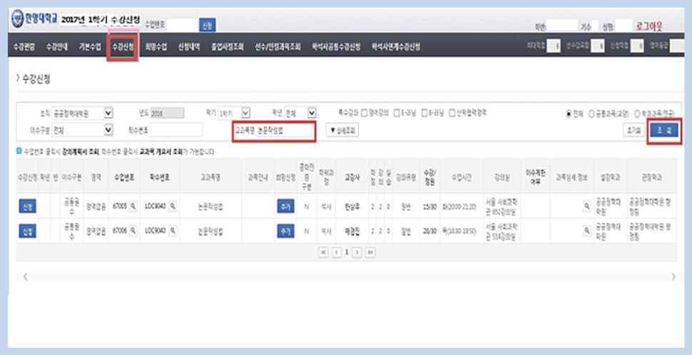 교과목명에 수업명을 적은 후 조회하면 해당과목을 조회할 수 있습니다.
