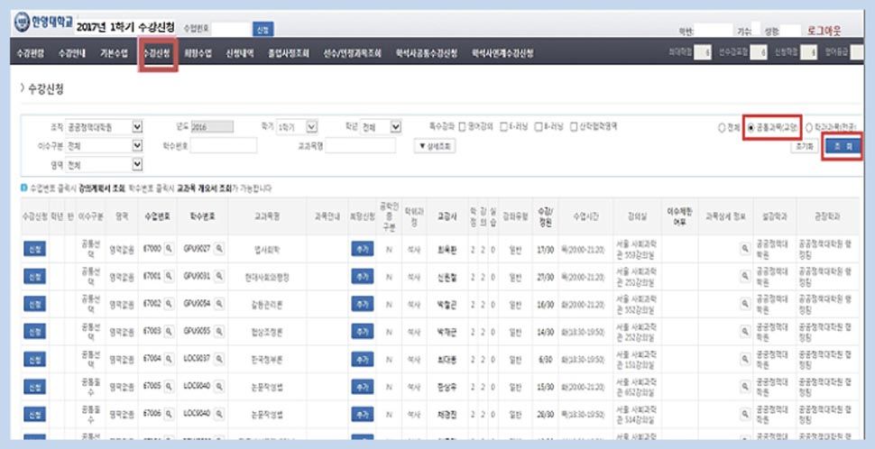 공통과목(교양)을 클릭하고 조회하면 금학기에 개설된 공통과목(교양)을 조회할 수 있습니다.학수번호 : 교과목의 고유 식별 번호이며 알파벳 3자와 숫자 4자 총 일곱 자리로 구성되어 있으며, 여섯 자리가 일치할 경우 같은 과목으로 인정됩니다. (예 : PSA9089 > 공공정책론) 학수번호는 한 과목이 신설되고 나면 변경되거나 없어지지 않으며 영원히 사용하게 됩니다.