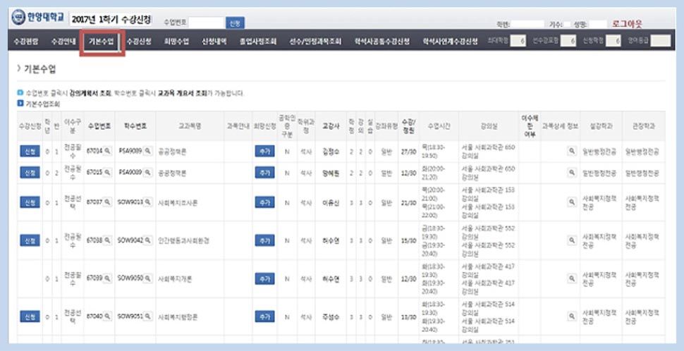 수강할 과목의 수업번호를 클릭하면 수업계획서를 확인할 수 있으며, 신청을 누르면 수강신청이 됩니다.