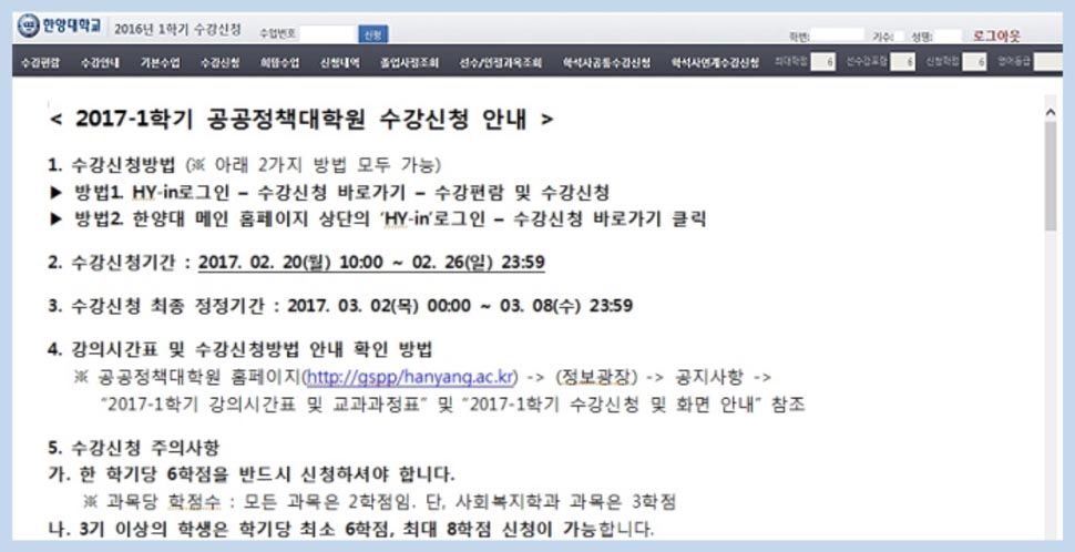 - 1. 한양대학교 포털사이트 중간의 “수강신청바로가기”를 클릭 [수강신청 방법 (교내/외 동일) : 인터넷 이용]
