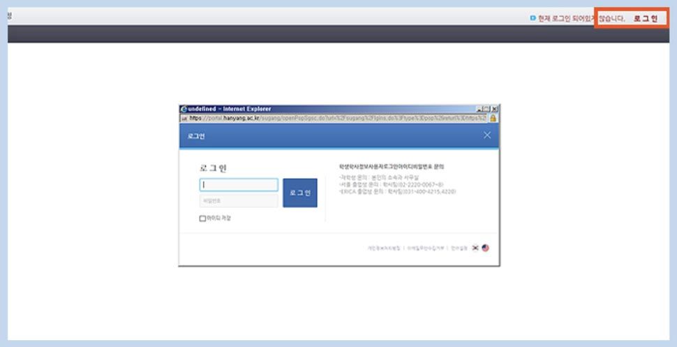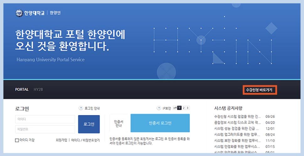 한양대학교 포털사이트(http://portal.hanyang.ac.kr/)의 “수강신청바로가기”를 통해 접속합니다.