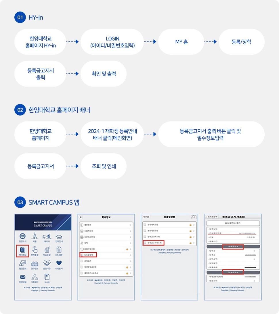 한양대학교 홈페이지 → 2024-1 재학생 등록안내 배너 클릭(메인화면) → 등록금고지서 출력 버튼 클릭 및 필수정보입력 → 등록금고지서 → 조회 및 인쇄 - SMART CAMPUS앱